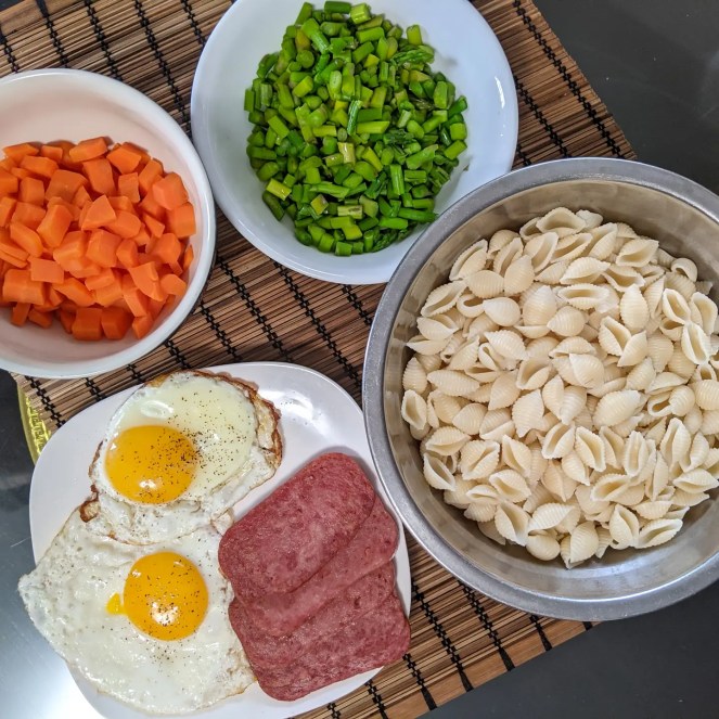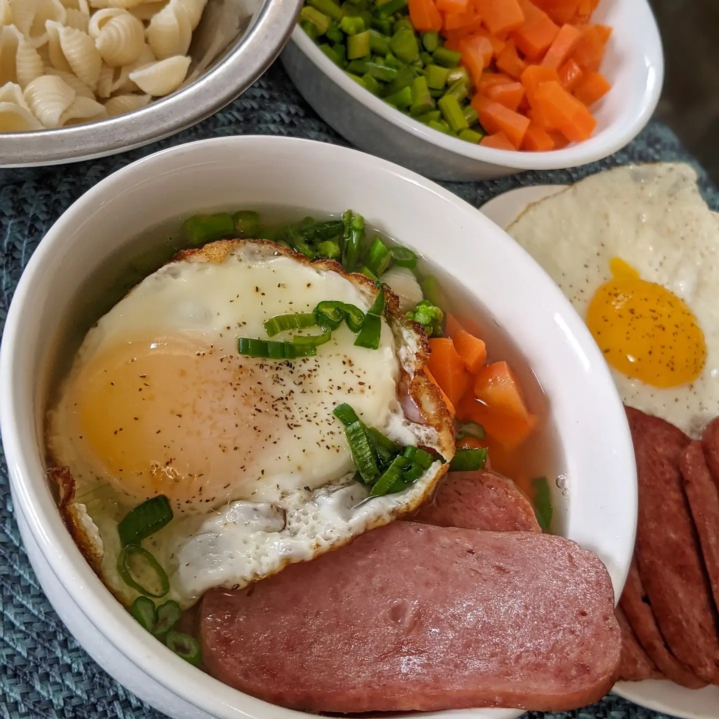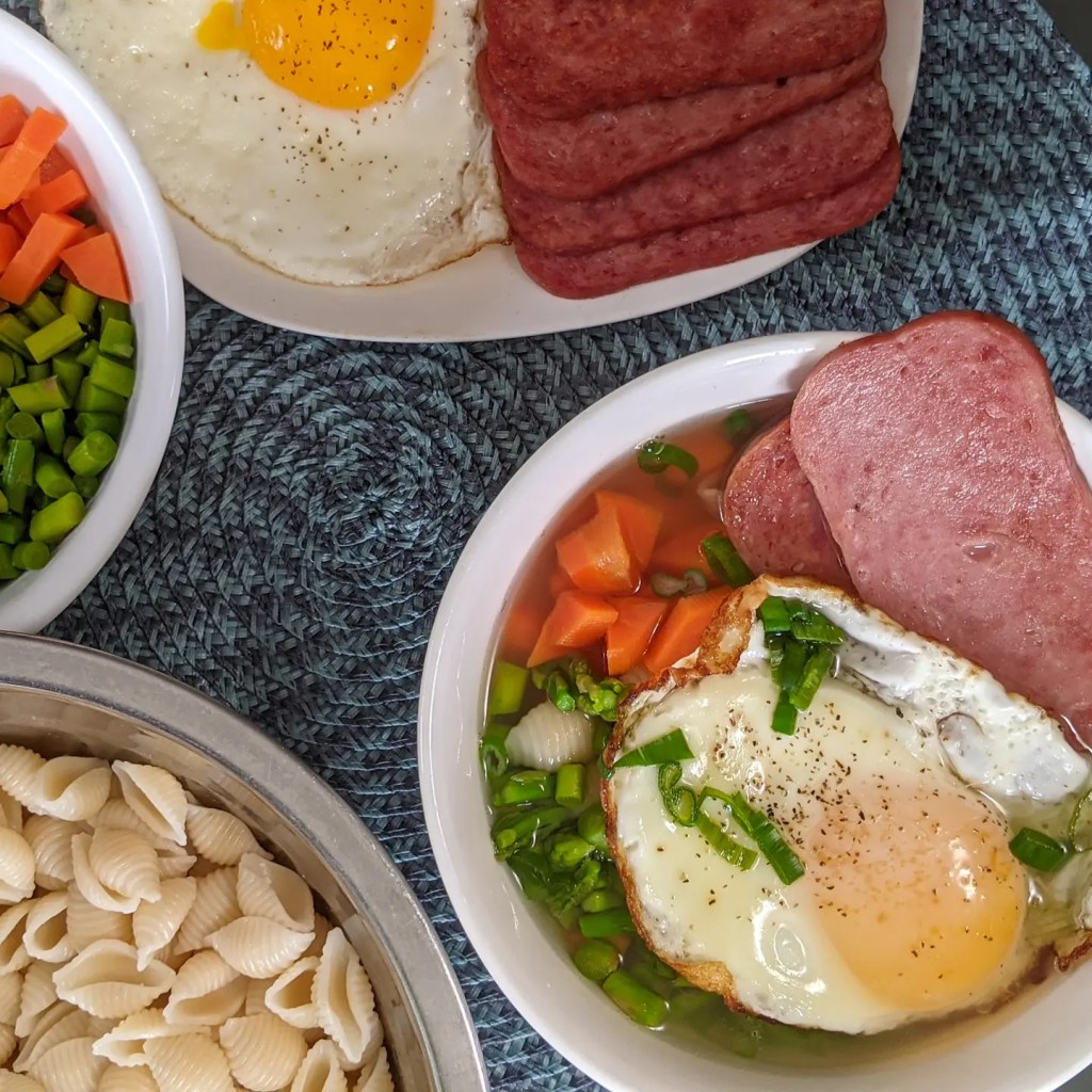 - Fill a bowl with some egg shell pasta, top it off with carrots/asparagus, green onions, slices of spam and egg. Pour the hot broth over and enjoy.