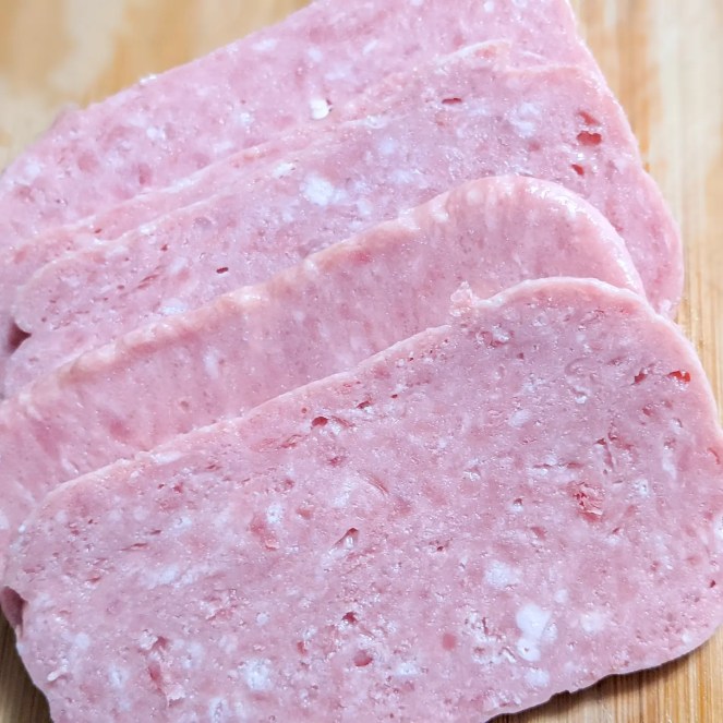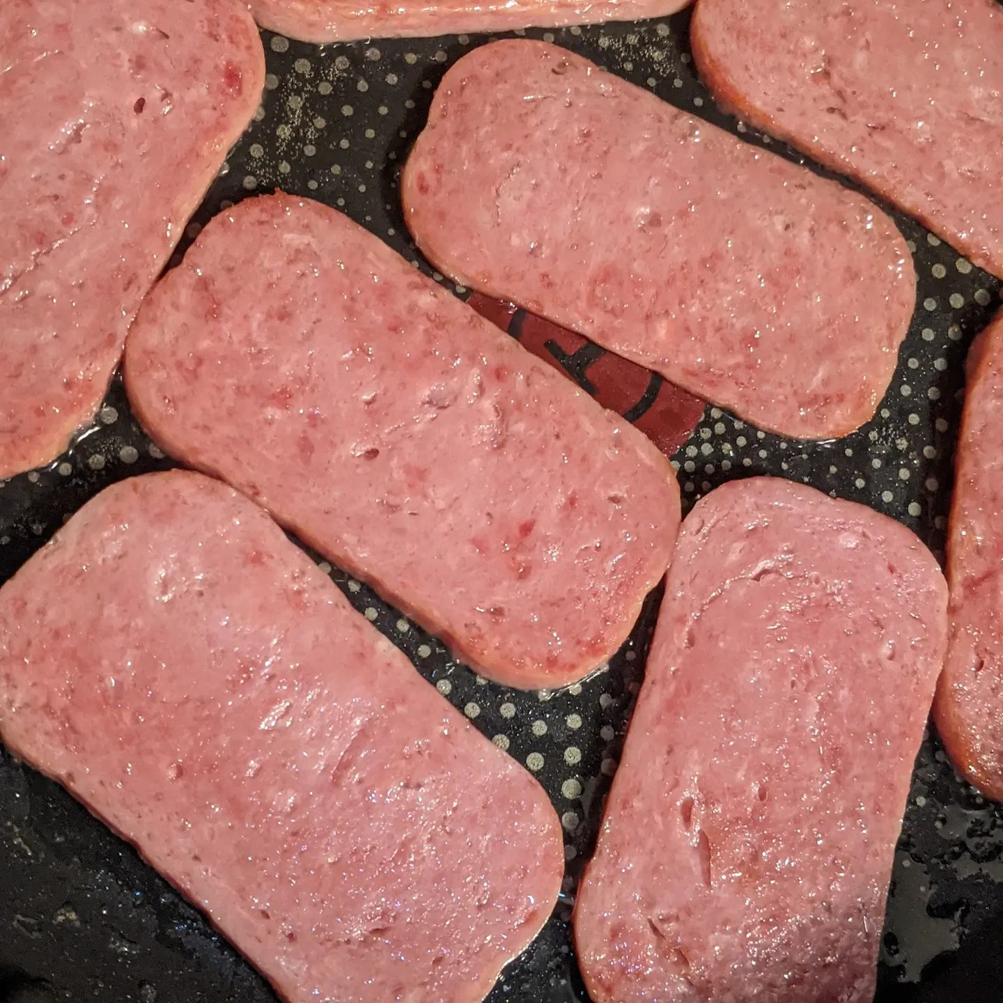 - Slice the spam into thick slices. Pan fry the spam until both sides are crispy. In the same pan, add in individual eggs and fry them sunny side up. Set the eggs to the side.