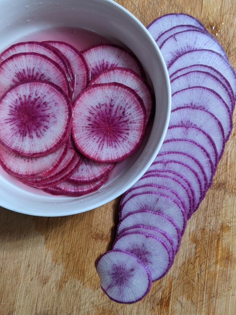 - Place the sliced daikon into the bowl and let it marinade for 30 minutes in the fridge.