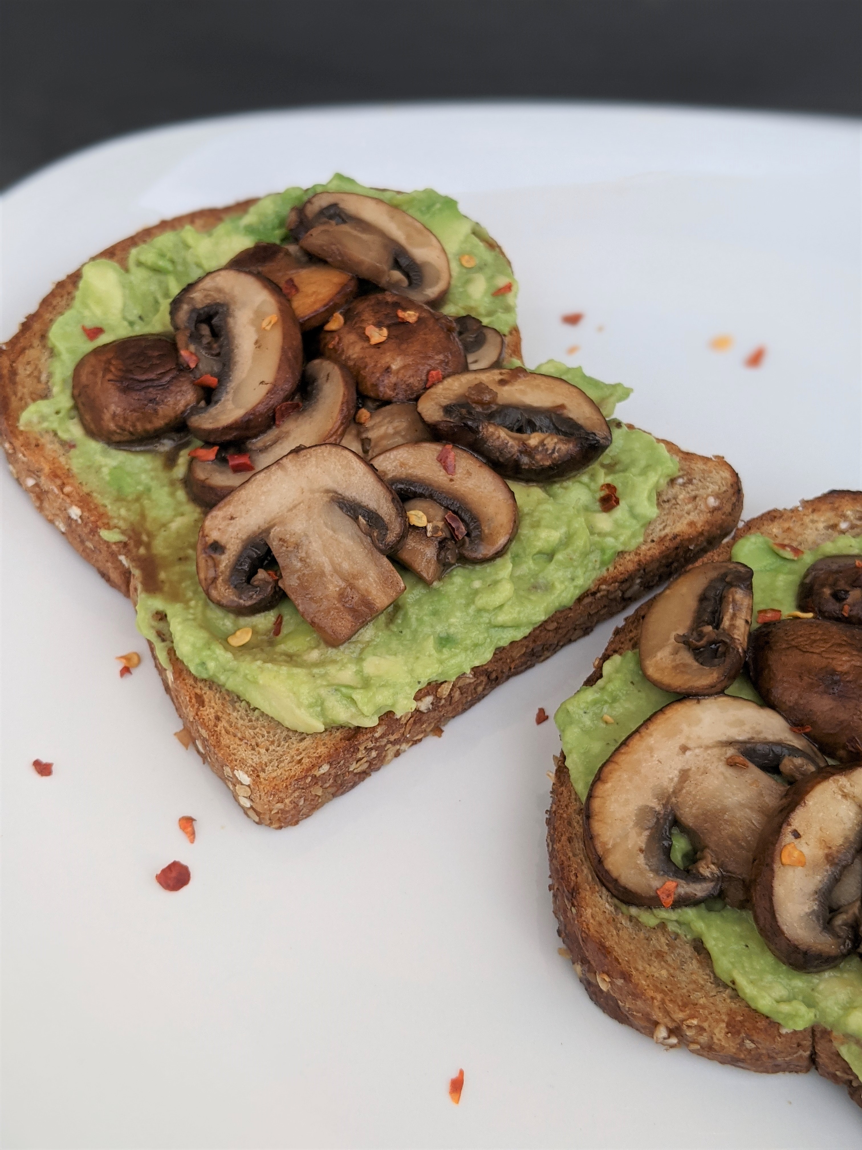 - Assemble the toast. Spread the avocado onto the toast, top it with mushrooms. If you like spice, add some crushed red pepper.