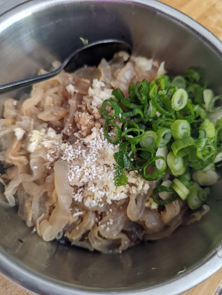- After the jellyfish is dry, add it into a mixing bowl. Add soy sauce, black vinegar, sugar, sesame oil, mushroom bouillon, garlic, ginger, green onion and chili oil. Mix until the jellyfish is covered with the sauce.