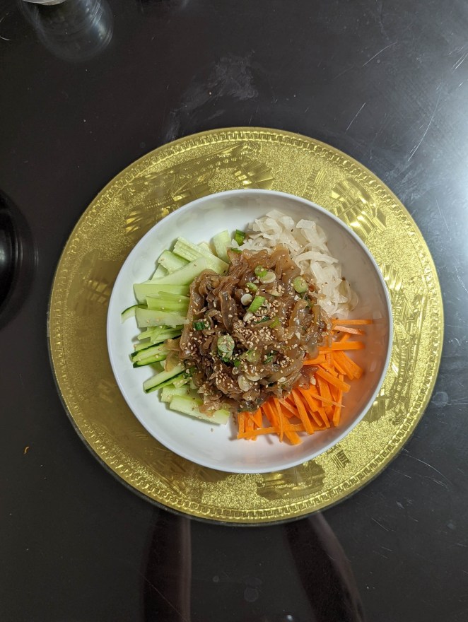- Add the sliced cucumber, carrots and daikon onto a plate. Top the vegetables with the jellyfish and drizzle sauce over. Sprinkle the sesame seeds and serve cold.