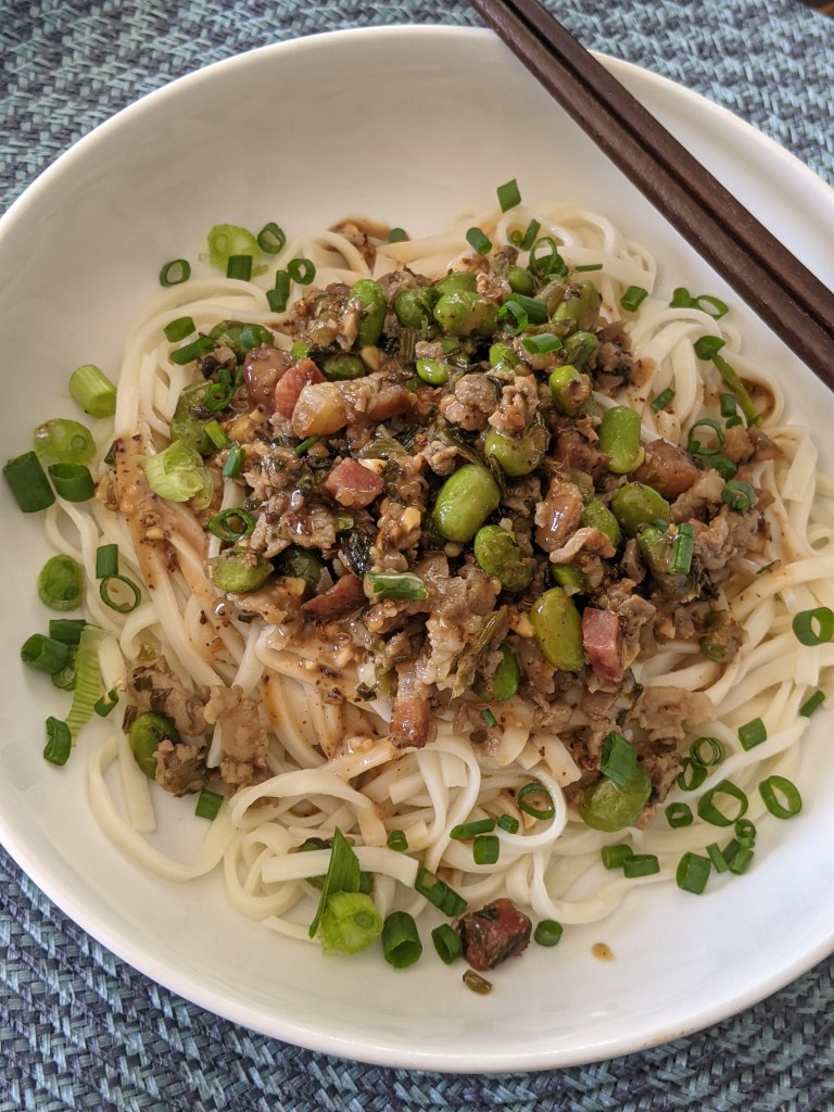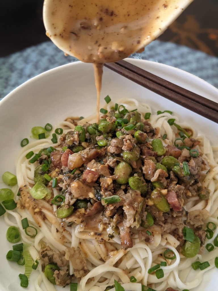- Place the sauce on the bottom of the bowl, add noodles, top with grounded meat and green onions . Mix well and enjoy!