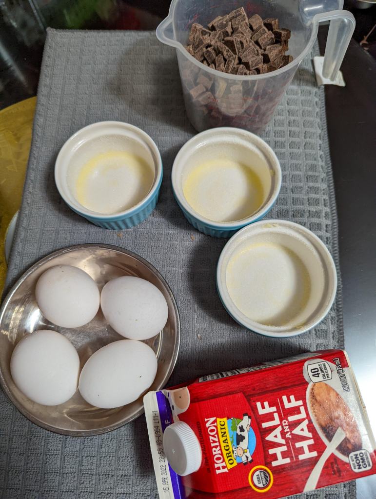 1. Pre-heat oven at 400F. Spray each ramekin with cooking spray or brush with melted unsalted butter. Add in 1/2 tablespoon sugar for each. Twirl the ramekin around so the sugar coats the side. Remove any excessive sugar from the ramekin. Set to the side.