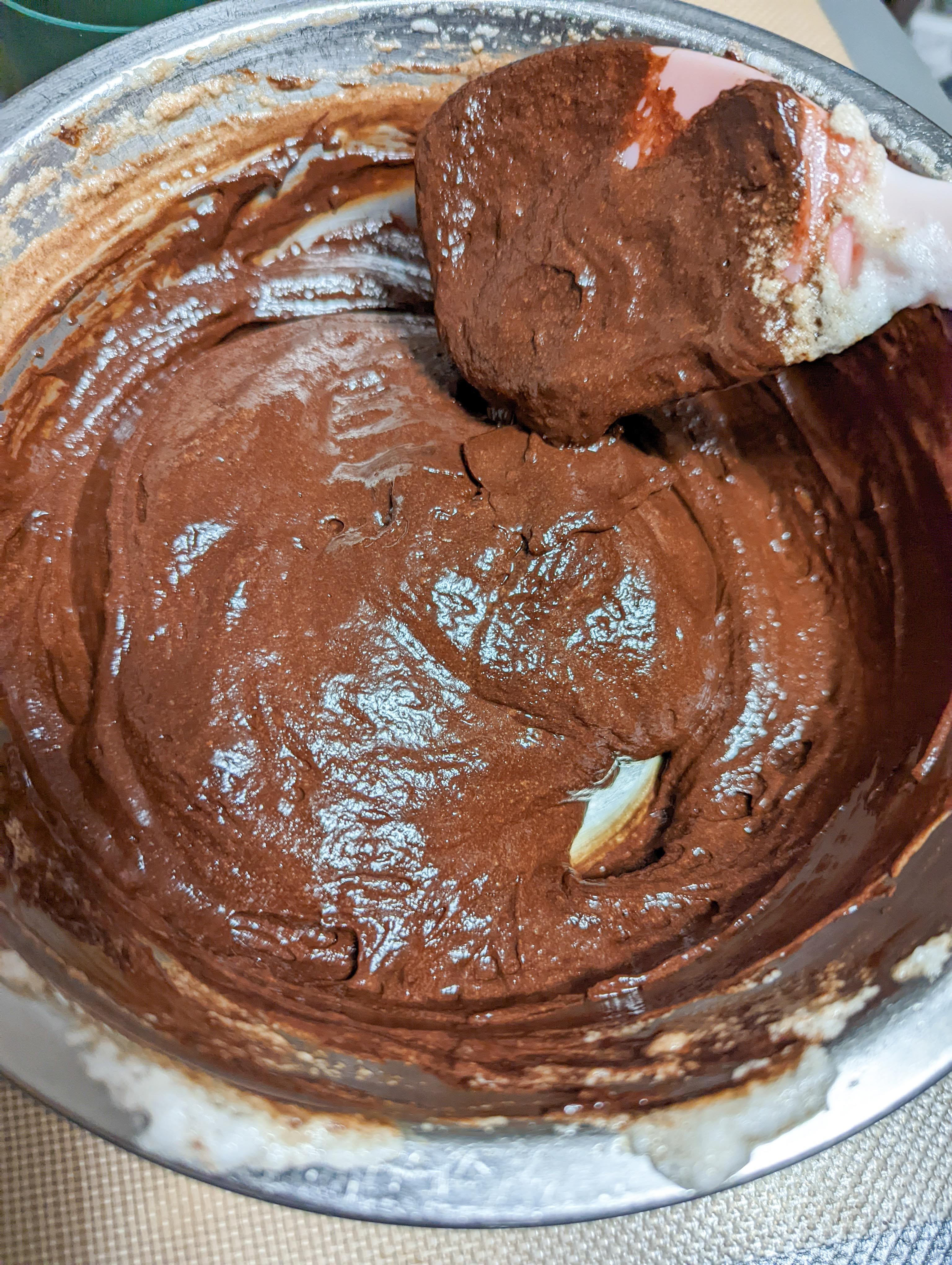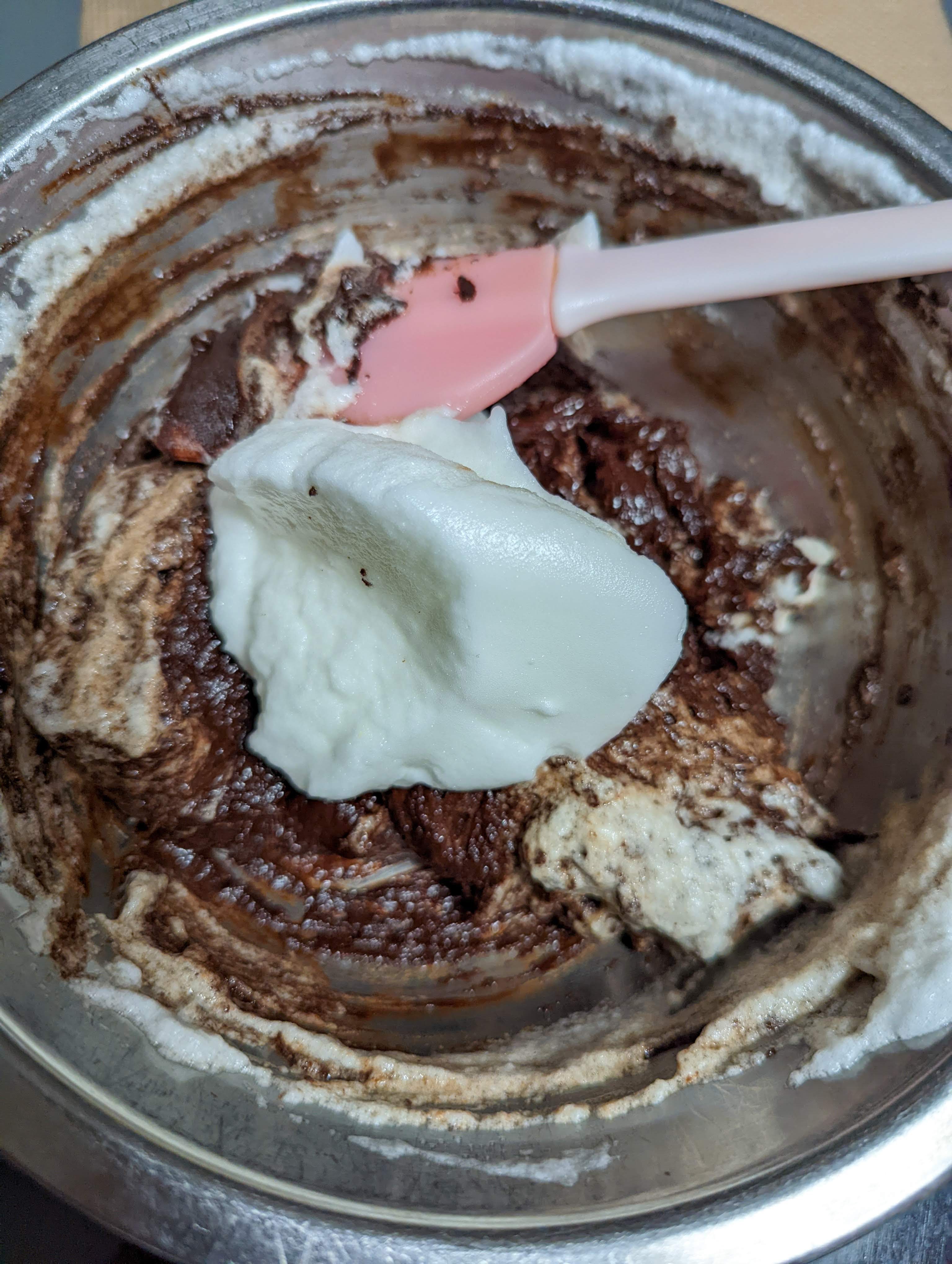4. Add egg yolk and salt into the cooled chocolate. Mix until combined. Add the egg whites into the chocolate and fold it lightly. DO NOT OVER FOLD