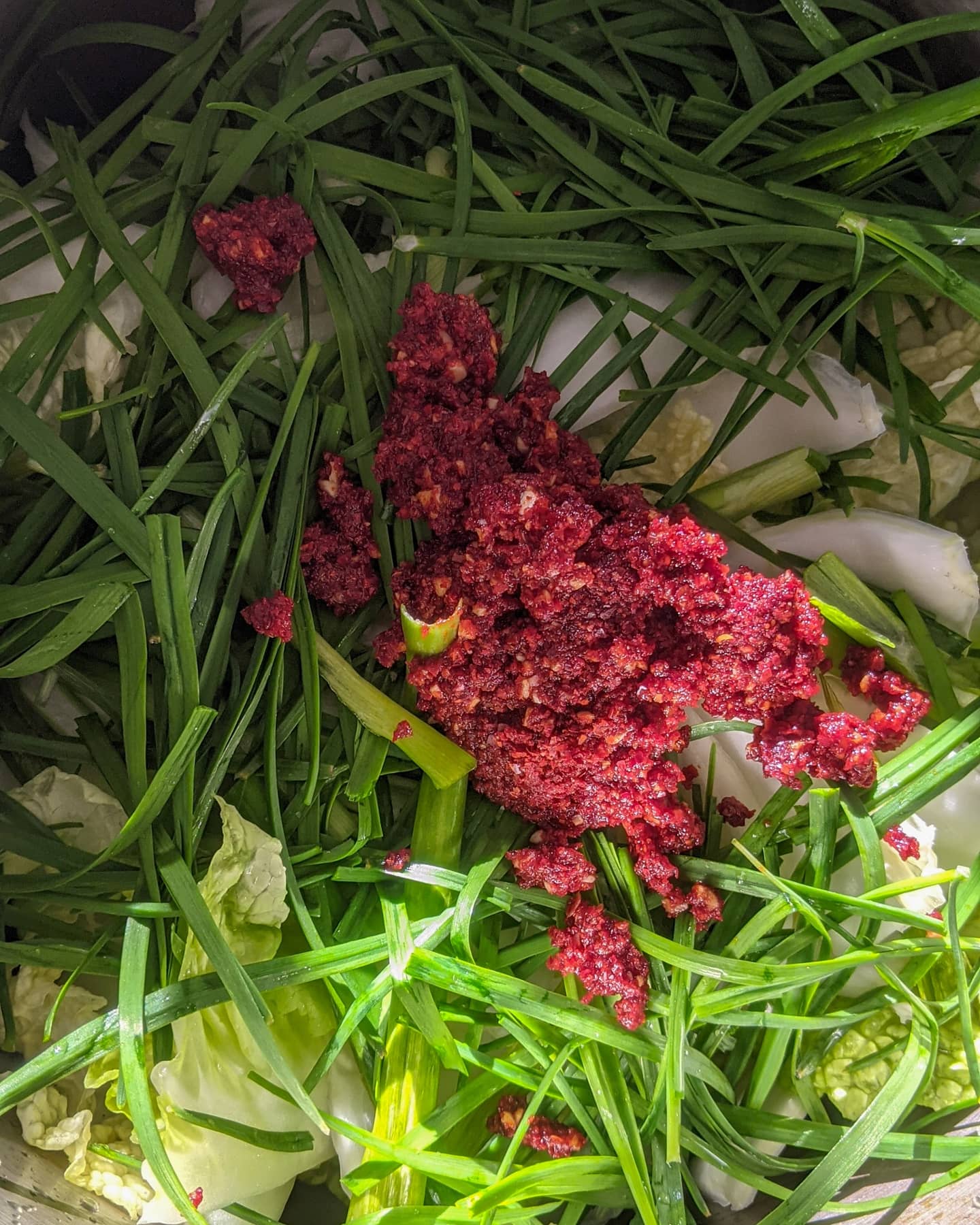 - Pour the Napa into a large bowl, add in green onions, chives and the paste. Mix in well, making sure the cabbage is completely covered with the paste.