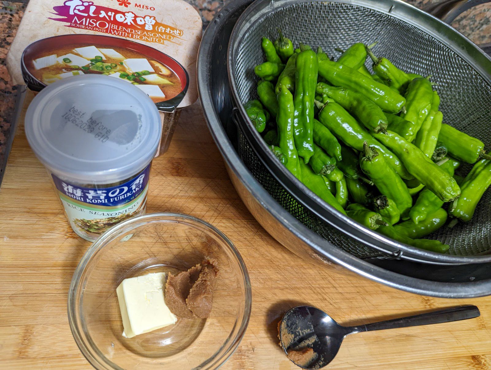 After the peppers are all blistered, turn off the heat and add in the miso butter mixture. Toss the peppers until they are well coated. Sprinkle some furikake then serve while it is hot!