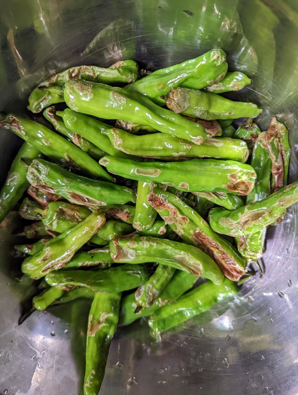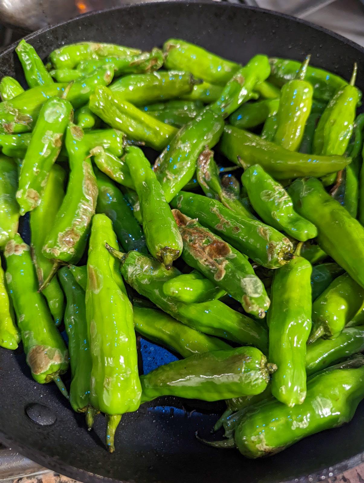 In a pan, turn on medium hi heat and add in the oil. Once the oil is hot, add in the pepper. Make sure to toss it around constantly so each pepper creates a blister. This is what we want.