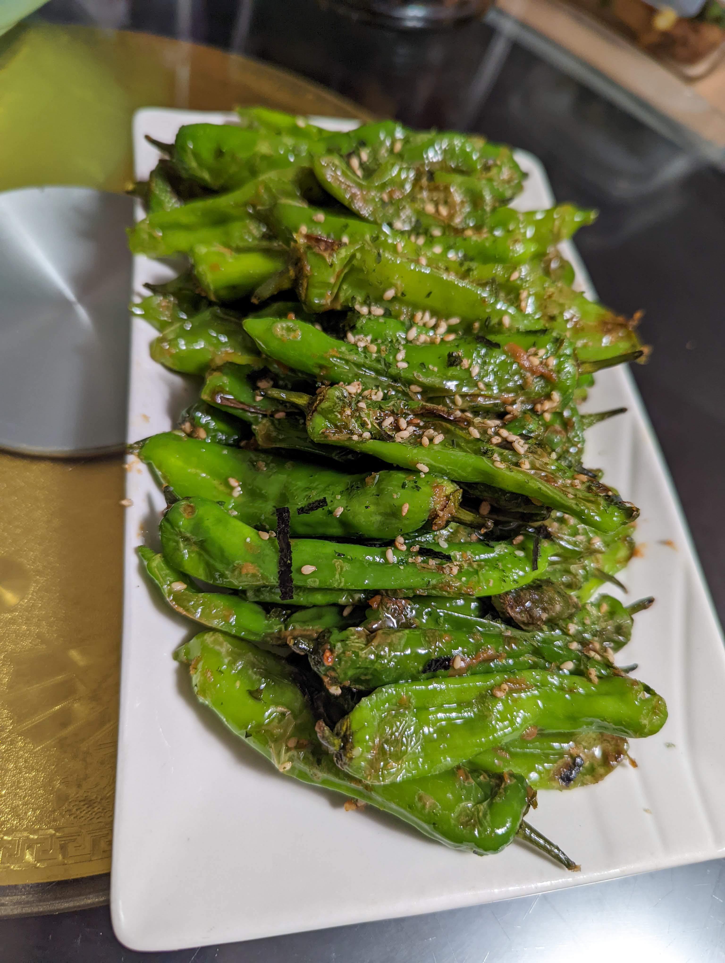 I got a bag of shishito peppers from Trader Joe’s and couldn’t decide if I wanted to broil the peppers or cook them over the stove. Cooking them over the stove was a good choice. This is such a great dish for an appetizer. Quick and easy, just takes about 10 minutes!