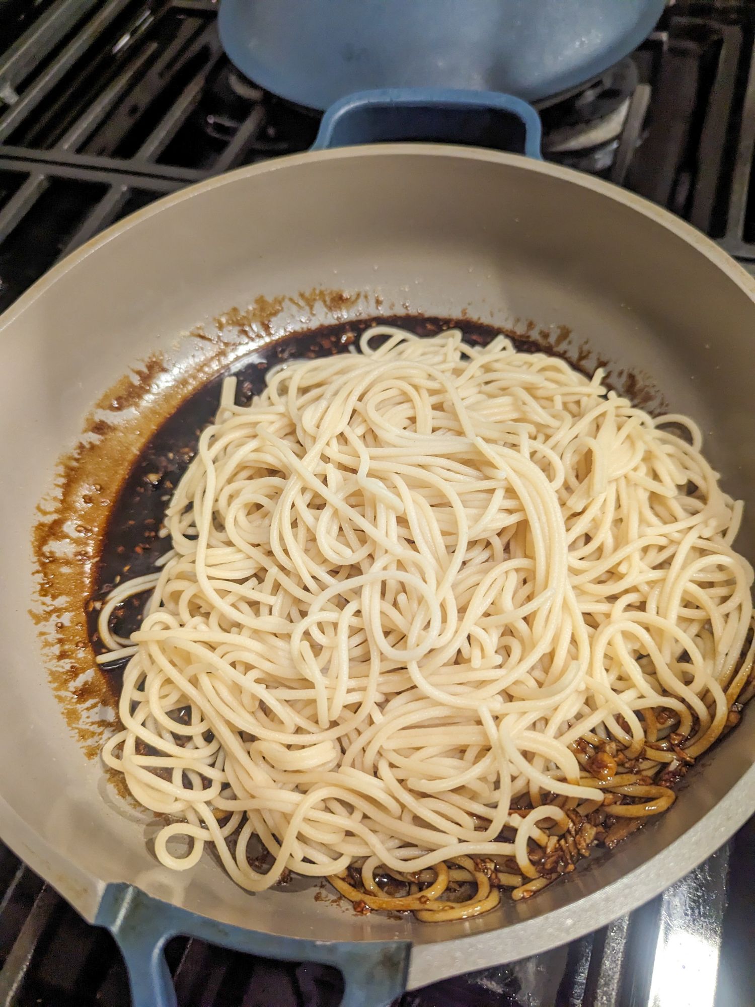 - Add the cooked noodles to the simmering sauce. Gently toss to combine. Remove from heat.