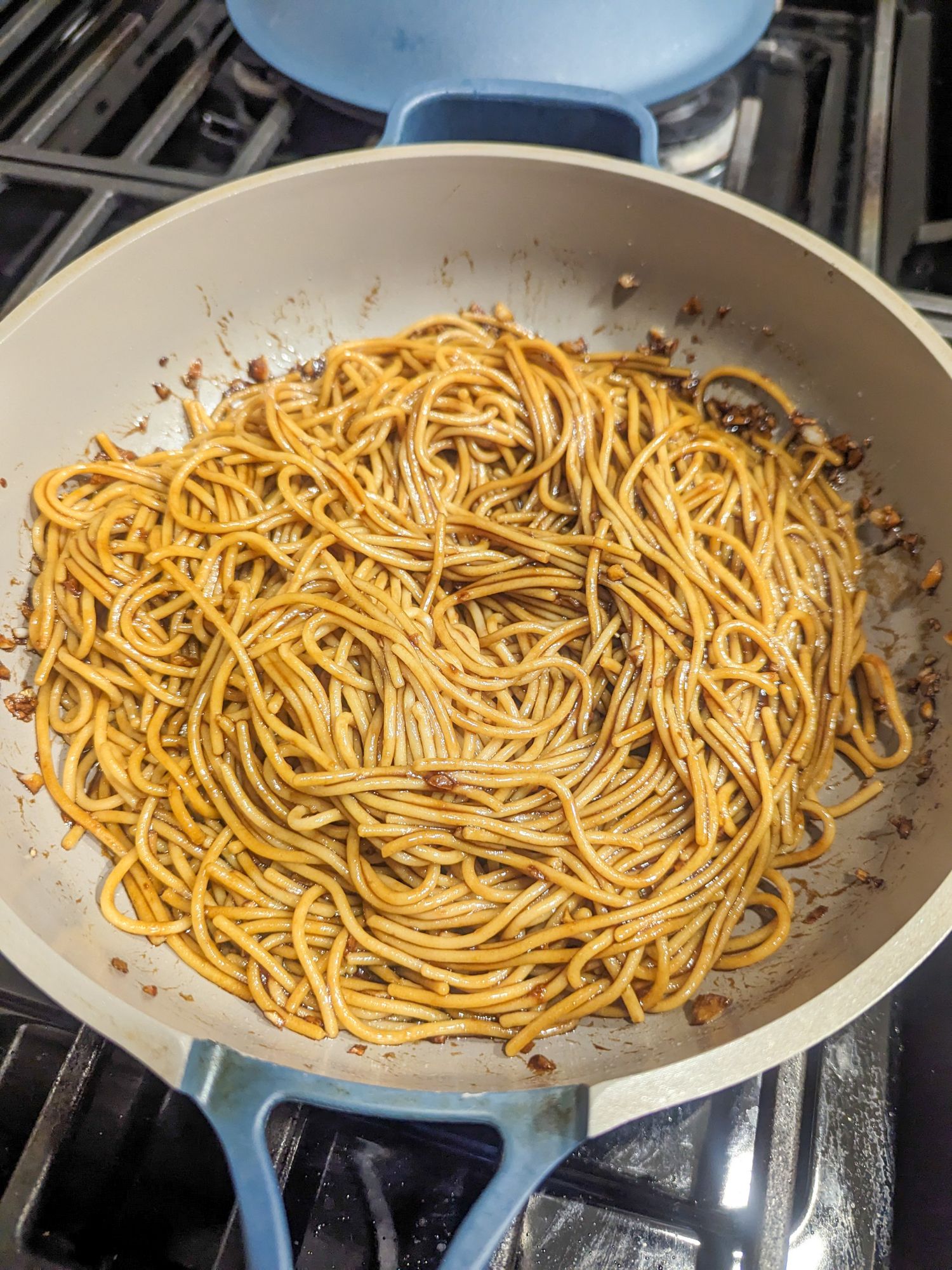 Add the cooked noodles to the simmering sauce. Gently toss to combine. Remove from heat.