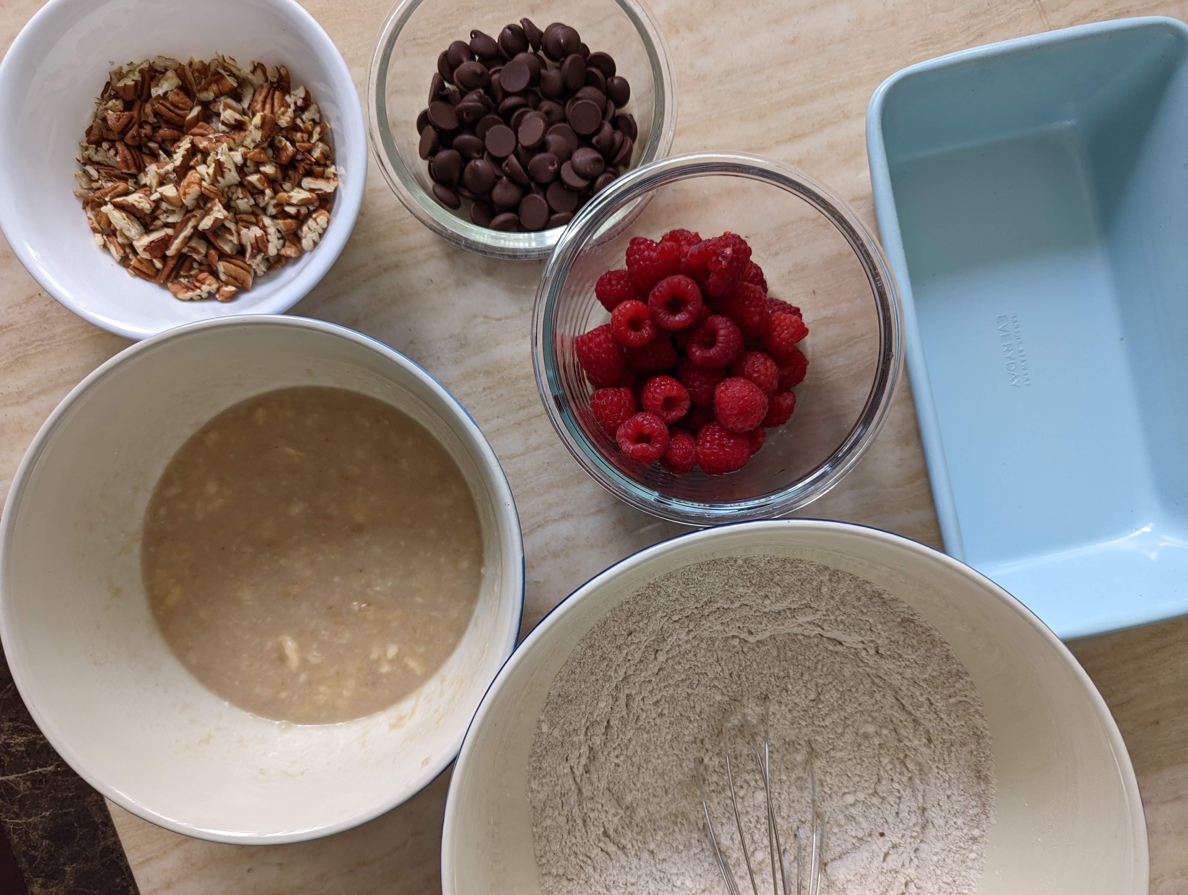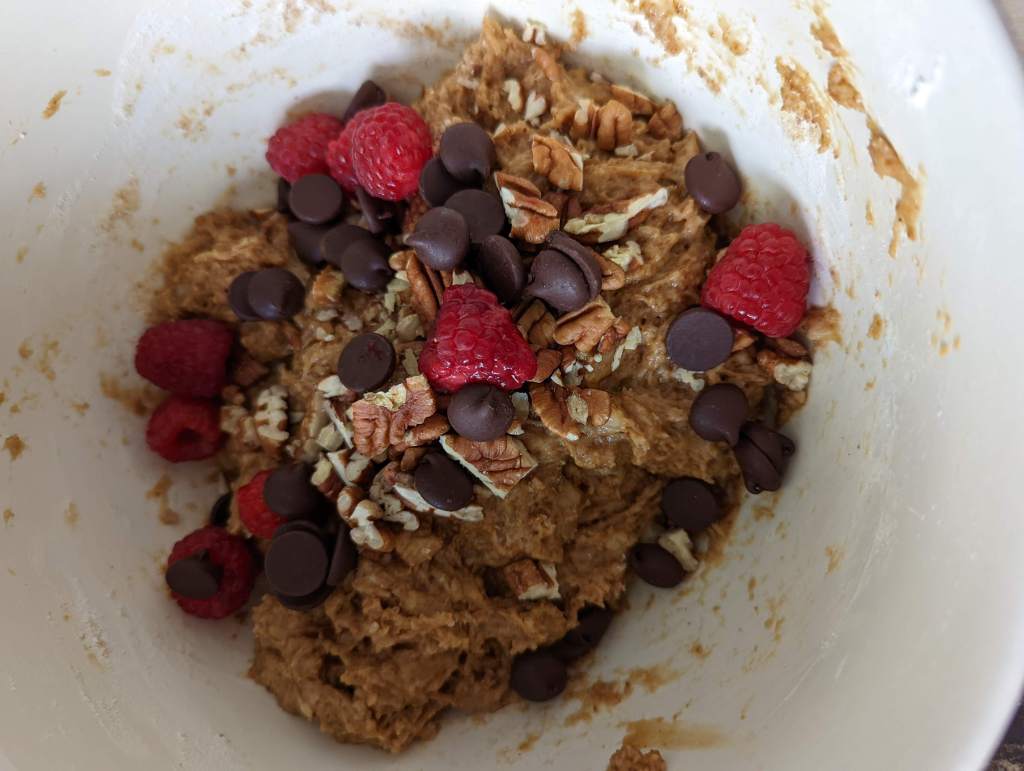 - Slowly add the wet ingredients into the dry. Fold in the raspberry , chocolate and nuts.