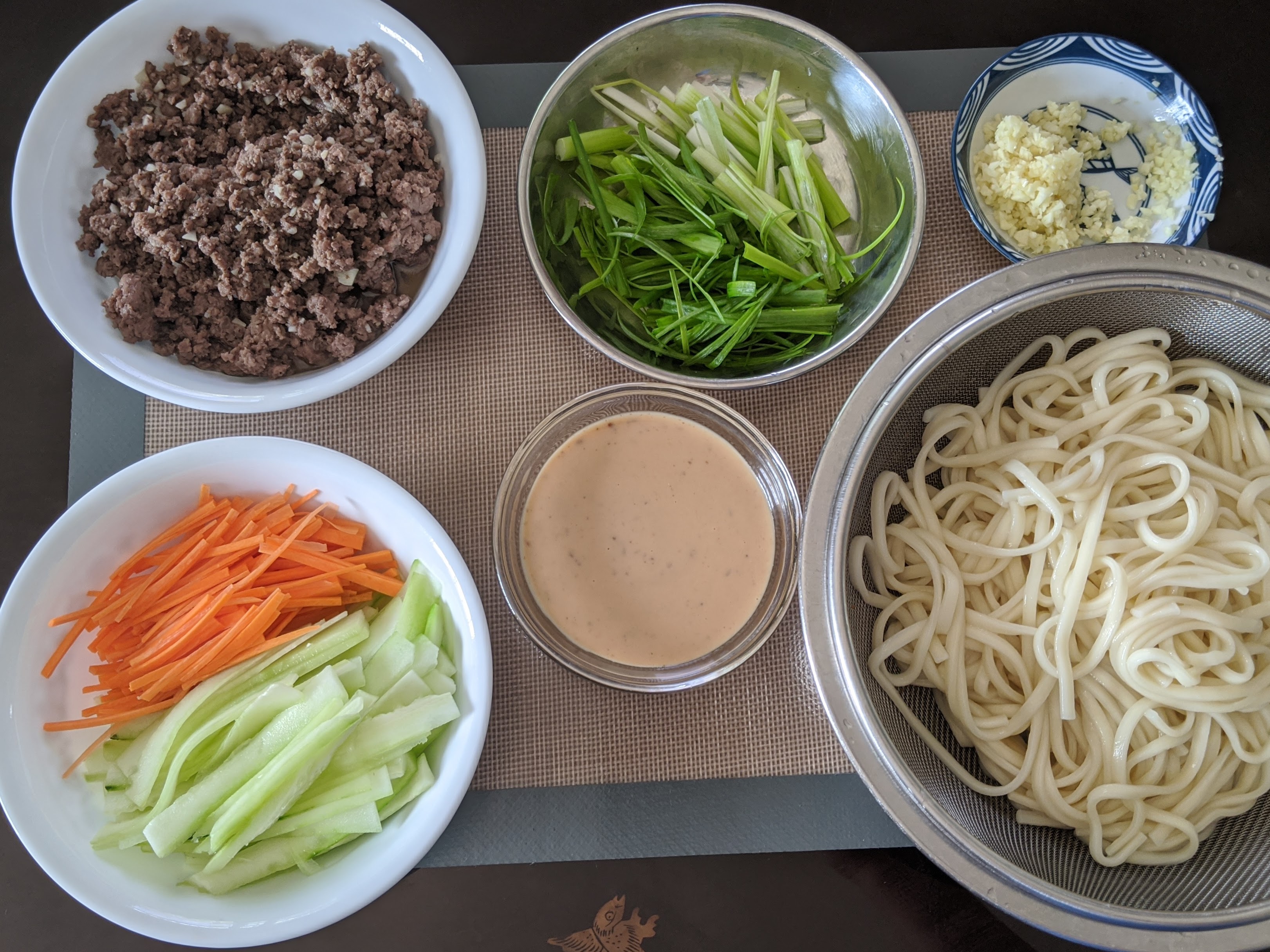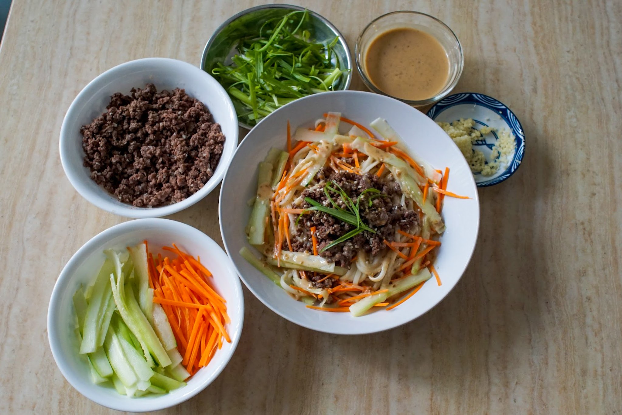 - Toss the noodles, cooked ground pork. sauce, cucumber and carrots. Stir to mix well. Ready to be served.