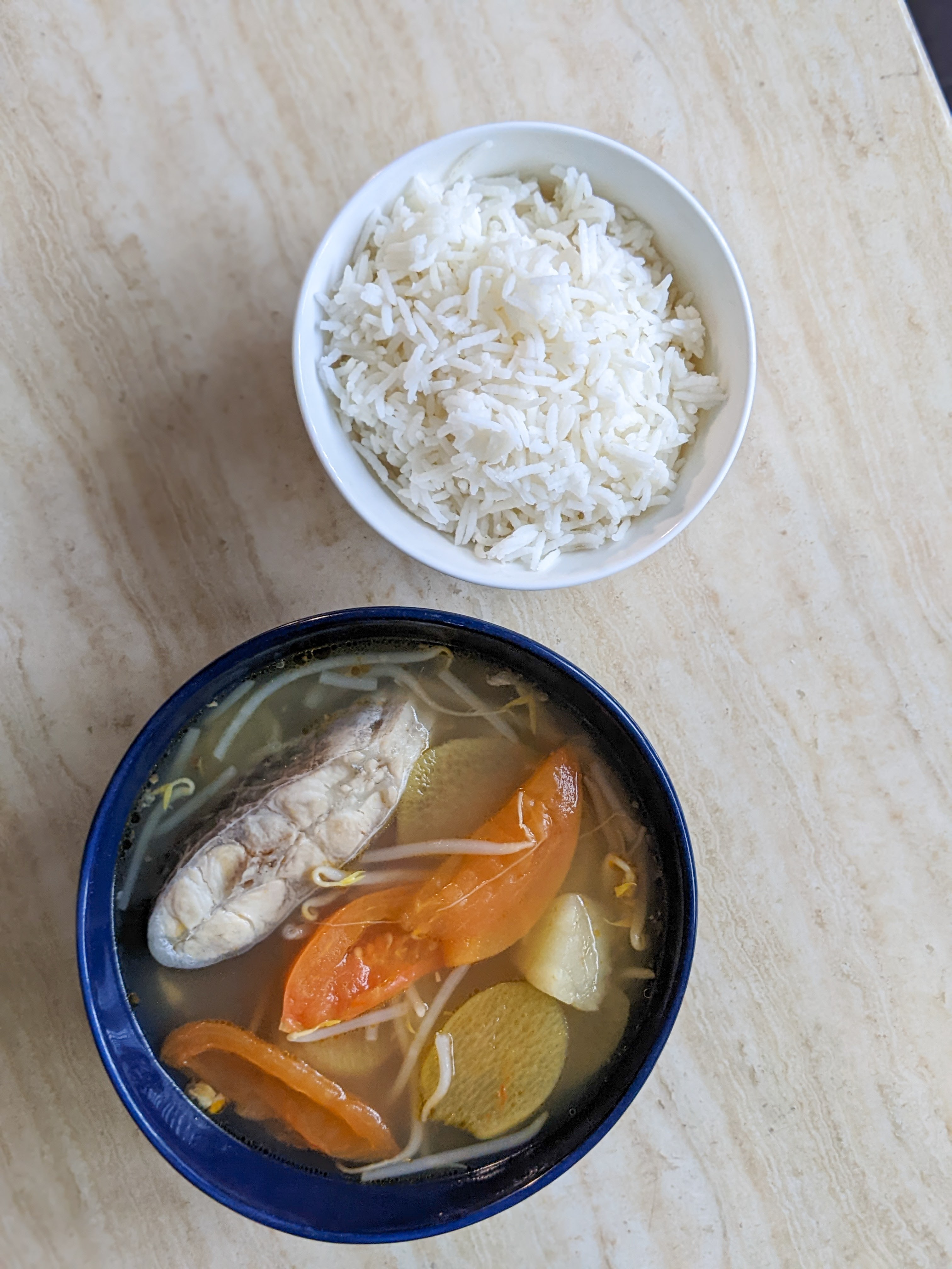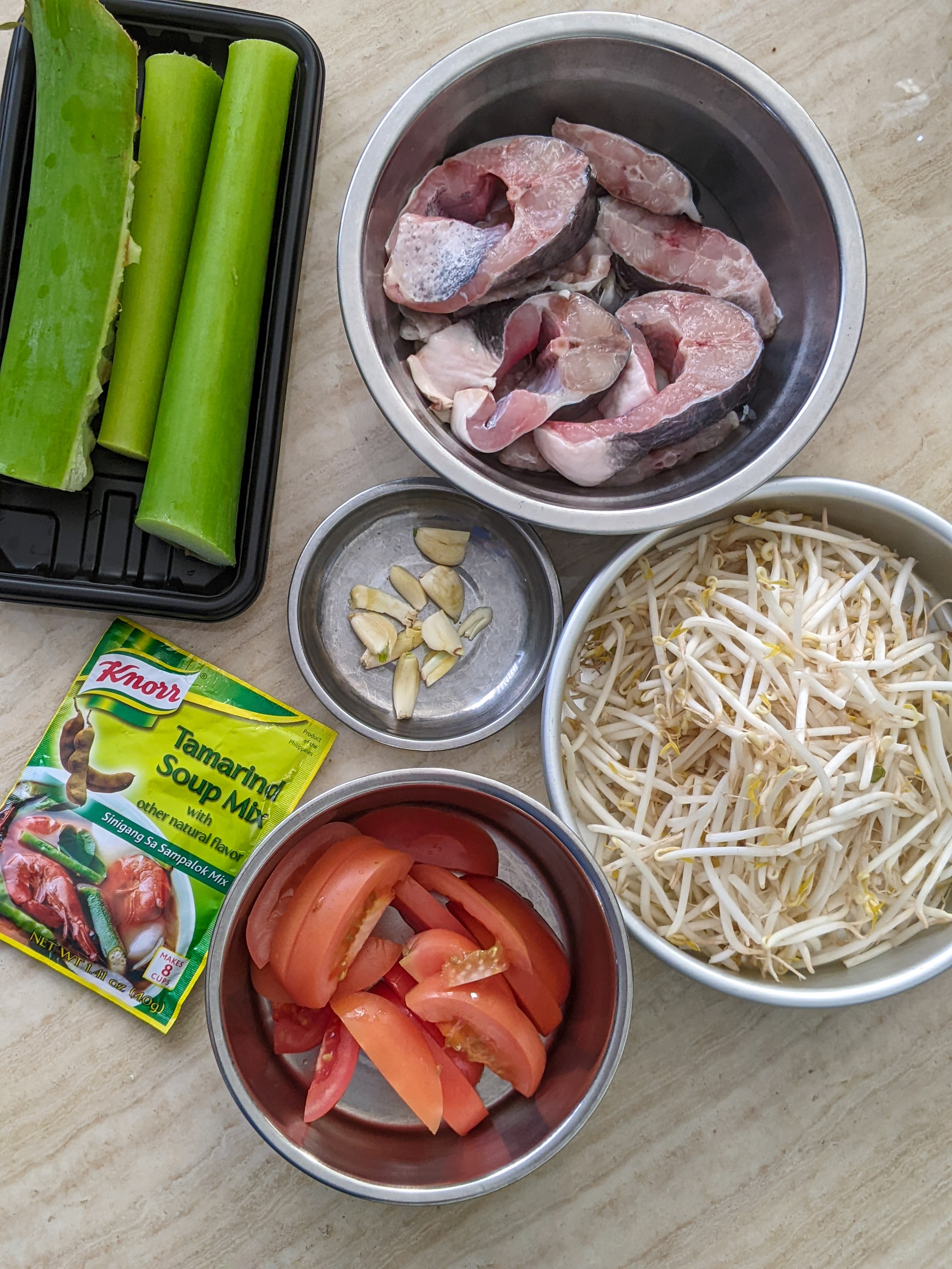 Add in water, tamarind soup mix, fish sauce, and sugar, pineapple, tomatoes. Mix well then add in the elephant ear stems and bean sprouts. Serve the soup with a bowl of rice.