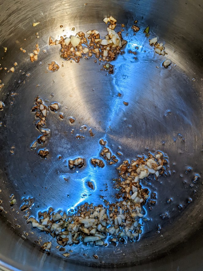 - In a large pot, medium heat, add in oil and garlic. Sautéed until the garlic is golden brown.