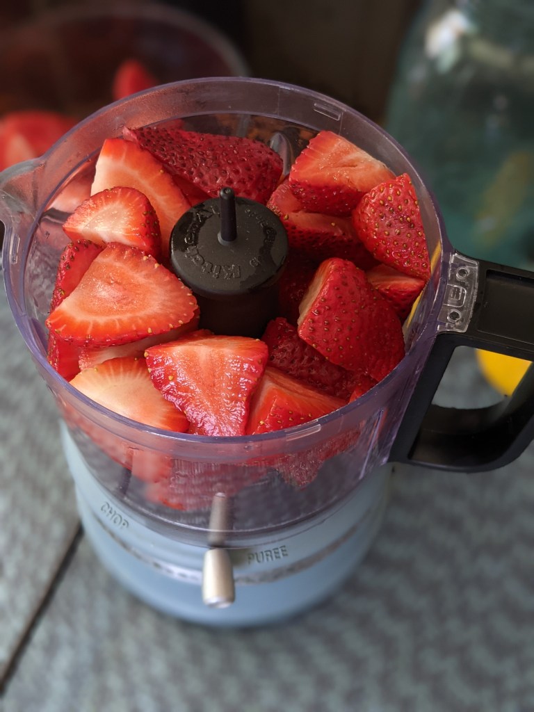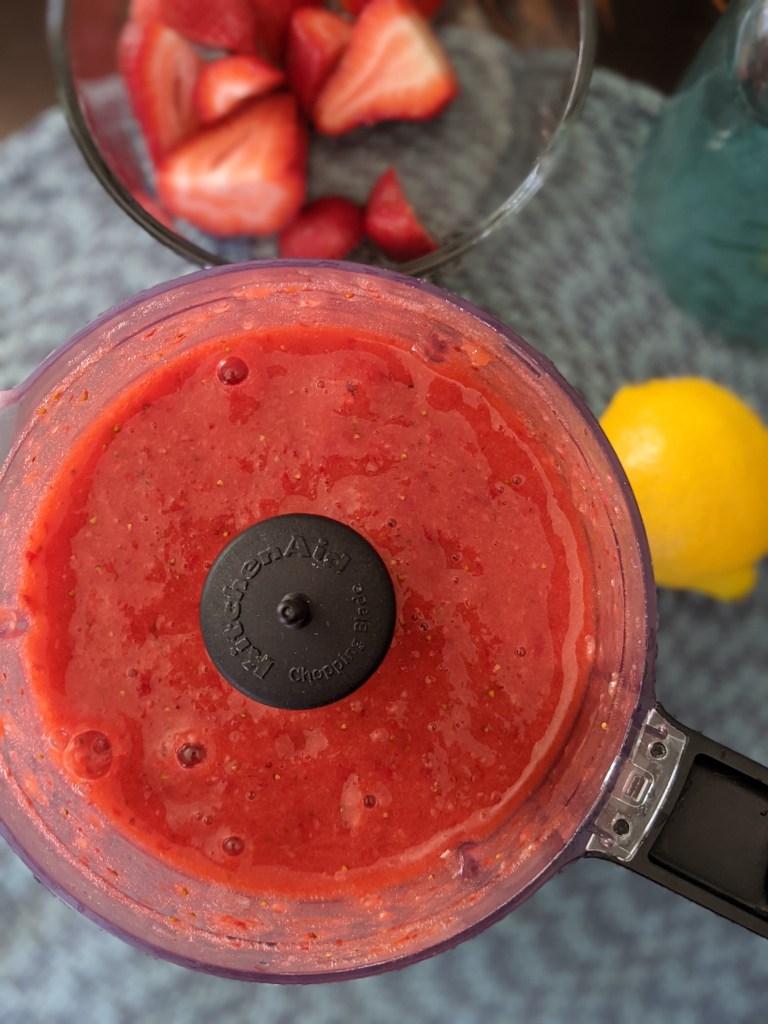 - Wash, clean and cut up the strawberries. In a food processor, blend the strawberries until it turns into a puree.