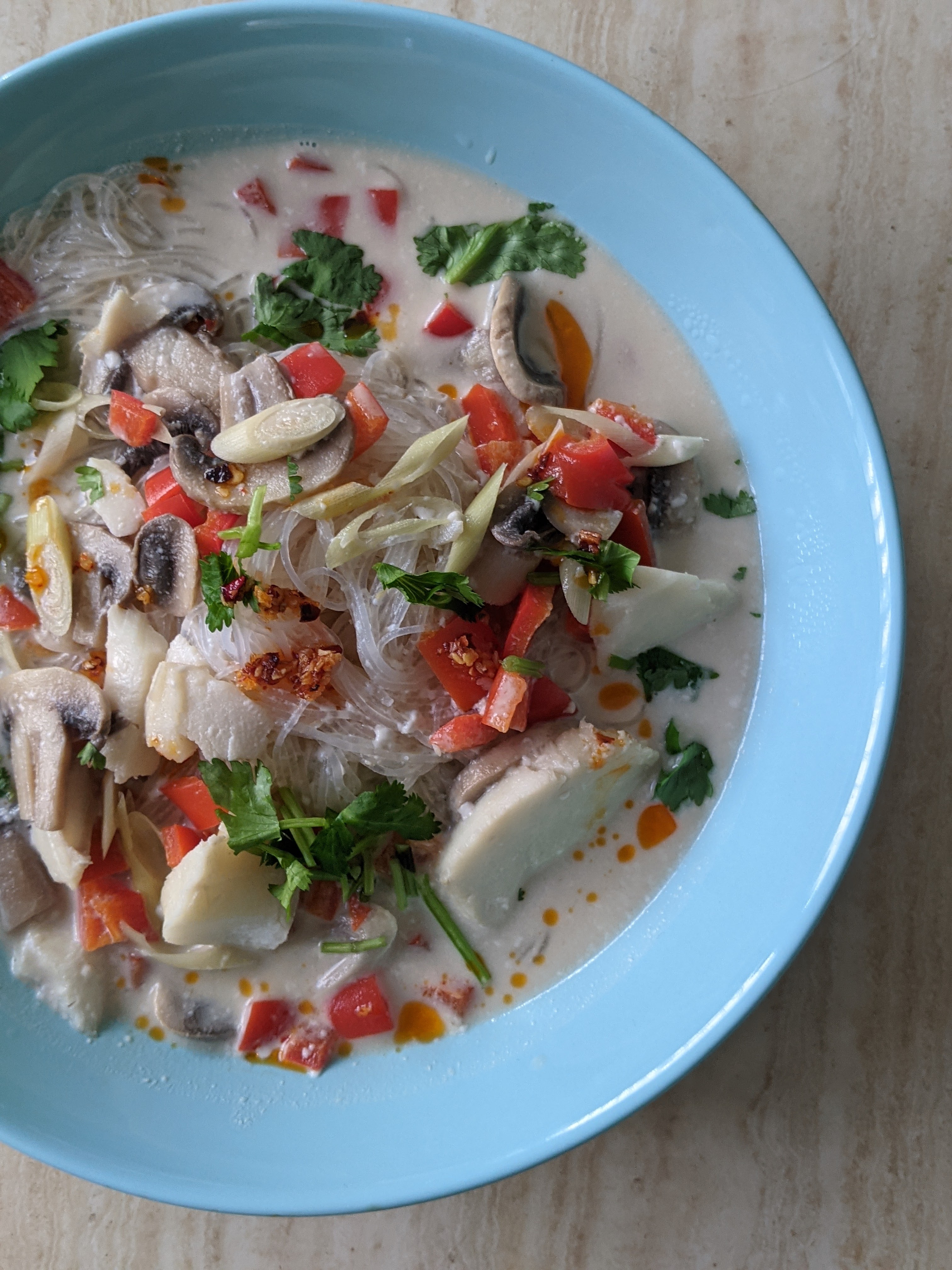 Soup day or noodle day? I picked both! Have you tried Tom Kha Kai ? Instead of chicken, I ended up using fish. I love vegetables in my soup. Not only does it give the dish a lively color, but also absorbs the flavor of the broth.