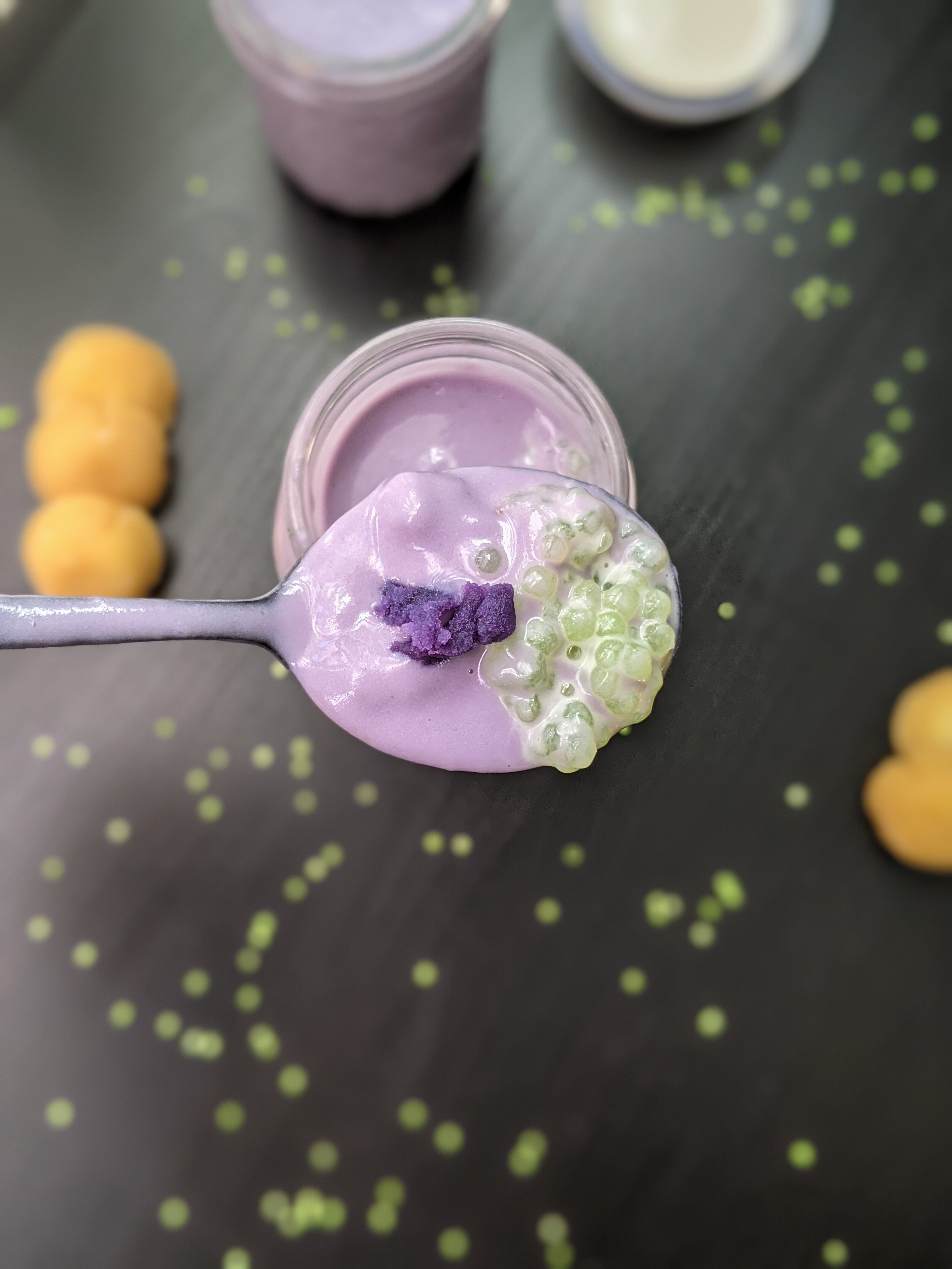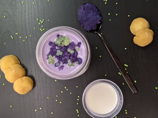 - In a bowl/cup, add 1/2 cup of the tapioca, drizzle coconut milk, ube cream and top it off with bits of purple yam. *For cold dessert, simply chill it in the fridge for an hour before serving. *For hot dessert, simply place everything from the assemble into a pot and cook for 2-3 minutes. You do not want to overcook, because the tapioca will dissolve.