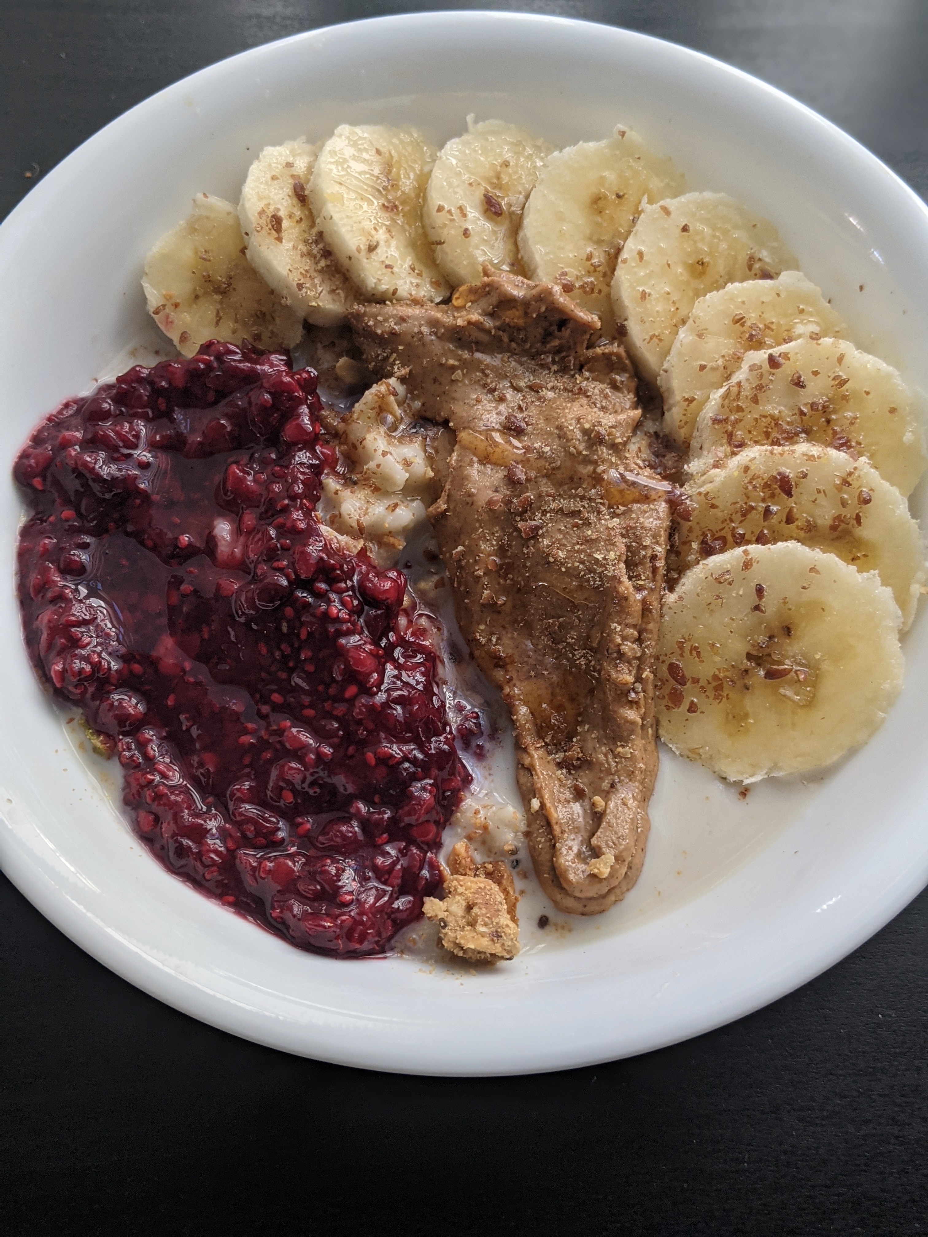 - Top with sliced banana, almond butter, granola, blackberry chia seeds and splash of milk.